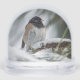 Un globe de neige avec une junco aux yeux sombres, parfois appelée un oiseau de neige, perché sur la branche enneigée d'un pin dans cette magnifique scène hivernale. Les juncos aux yeux sombres sont de mignons moineaux, comme on les voit généralement aux États-Unis en hiver.