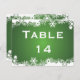 Carte postale de numéro de table de mariage vert d'hiver Snowflake, avec une bordure blanche de flocons de neige sur l'arrière - plan vert brillant. Un choix parfait pour les mariages d'hiver décembre.