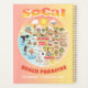 Un dessin spectaculaire de la Californie du Sud - mettant en vedette Los Angeles, Orange County, San Diego. Cette scène lumineuse et charmante a tout - un surfeur pend dix pendant qu'un couple joue dans l'eau, un orque saute, un couple de plage musclé à flex pour impressionner, des animaux de zoo attendent les touristes, un t-rex rugit un défi, le tout sous le soleil de Californie brillant au-dessus de tout.