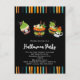 Invitation de fête d'Halloween avec un cupcake d'Halloween avec un gros globe oculaire. Un coquelicot vert en forme de monstre de Frankenstein. Une tasse avec un visage crânien rempli de friandises et de bouc vert gouttant.