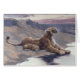 Lioness se repose à côté de son petit sur un rivage sablonneux au bord de l'eau. Elle veille prudemment à tout danger. Magnifique carte vintage de la faune.