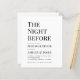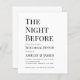 Une invitation à dîner simple et minimaliste en noir et blanc. Il n'y a que du texte noir sur un arrière - plan blanc. Le titre "La nuit avant", l'occasion "Dîner de répétition" et le nom sont écrits en casquette plus gros, le reste en petits casquettes. Le texte est aligné à gauche.