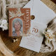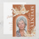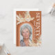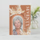 Cartons d'invitation pour une fête d'anniversaire de 70 ans bohème rustique avec un fond orange brûlé avec un arc-en-ciel, une photo de la fille qui fête son anniversaire, des feuilles de palmier séchées aquarelles, de l'herbe de pampa, des fleurs et un texte élégant pour célébrer soixante-dix ans au verso qui est facile à personnaliser.