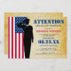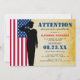 Rustic Farewell Party invitation à célébrer un soldat qui commence son voyage dans l'armée. Cet invitation de salut est parfait pour un départ, un retour à la maison ou une fête de retraite. Il est doté d'un arrière - plan vintage, d'un drapeau, d'un salut de soldat et d'un modèle d'invitation moderne qui peut facilement être personnalisé.