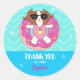 Ces autocollants représentent Sophie, un personnage de dessin animé pour chien, se reposant sur son flotteur gonflable en forme de beignet. Sophie est un chien brun et blanc qui porte un maillot de bain d'ananas. Elle porte des lunettes de soleil. Le flotteur gonflable à beignets a un glaçage rose vif avec des arroses colorées en vert menthe, violet, jaune et rose foncé. L'autocollant a un design de ligne ondulée et un accent brillant. "Merci" est en forme de ballons, et la partie signature du nom est en rose. Customisez ces autocollants avec votre propre message et nom. Ce serait bien de décorer des sacs cadeaux, de donner comme faveurs de fête ou comme une touche spéciale pour habiller les cartes de remerciement.
