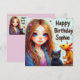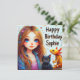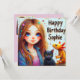 Ma belle fille avec un chat noir et un axolotl, célébrant l'anniversaire de Sophie. Les salutations sur la carte sont "Joyeux Anniversaire Sophie". Sur le dos de la carte se trouve une petite version de l'image avant, et beaucoup de place pour écrire un message. Fabriqué avec l'aide d'AI Bing.