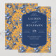 This wedding invitation features a vintage-inspired design with a balanced, vertical layout centered around a navy-blue rectangle framed by intricate blue floral patterns on a mustard-yellow background. The color palette combines deep navy and lighter blue hues against the warm yellow, creating an elegant and striking visual impact. The typography includes a mix of serif and script fonts, adding a formal yet inviting tone to the overall sophisticated and celebratory mood. Perfect for couples seeking a timeless and romantic aesthetic, this invitation is ideal for commemorating their special day with style and charm.