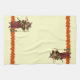 La mignonne sorcière porte son chat d'Halloween noir sur une serviette de ton jaune avec un ourlet de fleurs colorées d'automne