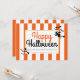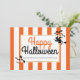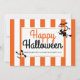 Sorcière et chauve-souris raye élégante carte plat Halloween. Cette carte d'Halloween moderne se concentre sur une silhouette de sorcière noire et des chauves-souris, ainsi qu'une bordure de motif rayé orange et blanc. Votre libellé est placé dans un cadre blanc avec contour doré.