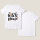 Préparez-vous à rire avec ce t-shirt "Sorcière s'il vous plaît" d'Halloween avec typographie moderne lettrée à la main associée à des chauves-souris éffrayantes subtiles et des citrouilles. Ce design simple mais attrayant dans les tons noir et orange est parfait pour un look Halloween ludique et tendance et intemporel.