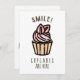 Smile! écrit dans une grande police moderne au-dessus d'un cupcake rose dans un liner de cupcake crème et pêche. "Cupcakes are Here" est écrit sous une élégante police gris pâle.