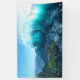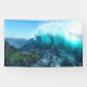 Une vague massive saute des mers agitées, brillant blanc et bleu et turquoise dans la lumière du soleil. Sous la vague, sur le point d'être submergée, se trouve une petite ville avec un château et des cottages médiévaux construits sur un promontoire rocheux.