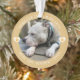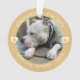 Ornement moderne élégant et tendance de souvenir de perte d'animal de compagnie, votre photo préférée dans un cadre rond, lettrage circulaire, coeurs décoratifs avec empreinte de patte superposée sur fond jaune poussiéreux.