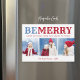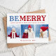 Cartes photo de Noël magnétiques personnalisées abordables avec un modèle simple pour la personnalisation. Ce joli design festif présente une typographie audacieuse BE MERRY aux couleurs bleu et rouge. Le message ci-dessous dit "Joyeuses fêtes de notre famille à la vôtre". Personnalisez-le avec 3 photos de famille, vos noms et l'année. Utilisez les outils de conception pour choisir des couleurs arrière - plans, modifier les polices de texte et les couleurs ou ajouter des photos pour créer une carte photo unique d'un genre.