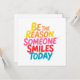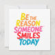 Éclairez la journée de quelqu’un avec cette carte de voeux joyeuse et stimulante, avec l’expression inspirante "Soyez la raison pour laquelle quelqu’un sourit aujourd’hui" en lettres vibrantes et colorées. Que vous le donniez à un ami ou que vous l'utilisiez comme un rappel quotidien pour diriger avec gentillesse, ce design livre un message d'encouragement, de joie et de bonnes vibrations.