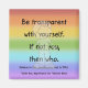 Un petit garçon transparent est debout avec les paroles de David A. Carrizales vu en face de lui avec un arrière - plan de couleur arc-en-ciel. La citation nous rappelle l'importance d'être transparents avec ceux qui nous entourent ainsi qu'avec nous-mêmes. Image de Christie Black de Creations from the Heart.