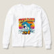This cheerful “Splash I’m 4” design features a playful dolphin jumping through colorful waves with a fun retro sunset background.