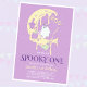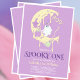 Conception effrayante d'Halloween avec une lune jaune fondante sur un fond violet et un fantôme mignon et effrayant. Parfait pour une mignardise effrayante ! Hou ! Personnalisez le nom de votre bébé pour une invitation d'anniversaire spectaculaire.