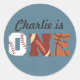 Autocollant de thème du premier anniversaire du sport. Personnalisez avec le nom du garçon d'anniversaire. Invitation correspondante aussi :