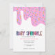 Faire-part de Baby Sprinkle avec glaçage rose et chocolat avec des paillettes au dos.