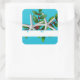 Autocollants cadeau de Noël bleu Aqua avec étoiles de mer et conception sainte. Deux étoiles de mer blanches, des feuilles verts aux baies rouges composent ce design. Une bande blanche au bas des autocollants carrés contient le texte "pour" et "de". Choisissez parmi deux tailles d'autocollants, mais s'il vous plaît choisir la finition mate pour la meilleure écriture des noms.