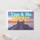 Carte romantique et moderne avec photo de quai de bateau tropical île au coucher du soleil avec aqua néon et texte or qui dit "You and Me Always". Texte personnalisable "Happy Anniversary" sur le dos