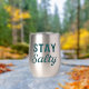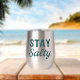 This 'Stay Salty' stainless tumbler features teal blue lightly distressed mixed vintage and modern fonts, creating a playful slogan. Whether you're salty from the sea breeze, or full of salty attitude, this graphic print stemless wine tumbler will show off your love for the beach.
