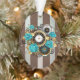 Patterned, antique watch, adorned with jewelry, gold hour hands and Latin numerals with turquoise roses on brown, striped background. Steampunk style.