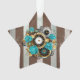 Patterned, antique watch, adorned with jewelry, gold hour hands and Latin numerals with turquoise roses on brown, striped background. Steampunk style.