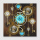 Turquoise lenses with antique watch with brass gears and golden keys on rusty, brown background. Steampunk style.