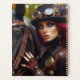 Un superbe coureur à vapeur victorien Lady foncé, avec des yeux bleus percés, des cheveux rouges, des lunettes et chapeau haut, se dresse à côté de son magnifique cheval noir en vêtements de cuir avec des engrenages d'horlogerie dans un royaume historique steampunk.