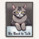 Journal dans une illustration d'un chat tabby gris à l'aspect sévère avec des yeux jaunes piercing reposant ses pattes avant sur une corniche, regardant directement en avant avec un air d'autorité sérieuse. Sous le chat, un script gras dit : "Nous avons besoin de parler", ajoutant humour et drame.