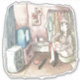 STICKER さやしくじ 衣類のかけてある部屋の座椅子に座ってテレビを見ながら靴下をはいている女性のイラスト