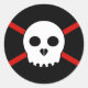 Un crâne blanc avec un X rouge derrière lui sur un autocollant noir.