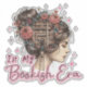 Illustration de charme montrant une femme avec ses cheveux dans un chignon et des fleurs dans ses cheveux. Dans sa tête, on voit une grande bibliothèque remplie de livres. Il y a une femme escalade une échelle pour atteindre les livres. Le texte coloré dit : "A l'ère des livres". Ce design est disponible sur une grande variété de produits.