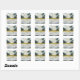 Cet autocollant magnifiquement conçu présente une toile de fond d'une forêt brumeuse d'arbres conifères avec des éléments de conception d'un rond avec du texte, et une bande de superposition or et blanc avec du texte.