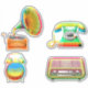 Une collection d'ancienne école, lecteur de disque rétro, téléphone, radio et réveil fait en teinture cravate couleurs.