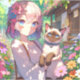 Une jolie fille d'anime aux yeux bleus tenant un joli chat siamois aux yeux bleus entouré de fleurs.