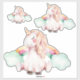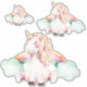 Unicorne souriante et lunatique assise avec des nuages et un arc-en-ciel. Illustration d'aquarelle sur trois signes