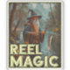 Cette image fantaisiste montre un sorcier debout près d'une rivière dans une zone boisée, tenant une canne de pêche avec un poisson flottant vers la ligne. Habillé de costume traditionnel de sorcier, dont une longue robe et un casquette pointu, le sorcier jette un sort magique en pêchant. L'arrière - plan, arboré et montagneux, crée une atmosphère mystique et sereine. Le texte "REEL MAGIC" affiché en bas de l'image ajoute une touche humoristique et magique à la scène.