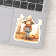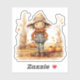 Un autocollant mignon avec un épouvantail souriant et des feuilles d'automne citrouilles et colorées.