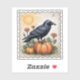 This artistic postage stamp features a regal black raven perched atop a vibrant orange pumpkin, surrounded by other pumpkins, autumnal flowers, and grassy patches under a soft, golden sun. The watercolor-like background adds a warm, rustic charm to the scene. Ideal for sending fall greetings, Halloween correspondence, or for collectors who appreciate nature-inspired and seasonally themed stamp designs with a touch of gothic elegance.