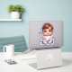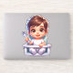 Joli dessin d'un bébé garçon aux cheveux bruns aux yeux marron assis sur une chaise tenant une cuillère. Autocollant adorable.