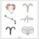 Envoie les dessins et les symboles du zodiaque de l'astrologie du Ram dans une page d'autocollant vinyle taillé sur mesure avec six images différentes. Délicats dessins à l'encre de couleur et de trait, symboles en noir et or, constellation noire d'étoiles, texte Aries dans une police moderne foncée.