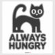 Chat noir stylisé avec de grands yeux et une expression ludique. Le corps du chat est conçu dans une forme simple et moderne, en mettant l’accent sur sa queue courbée et sa forme ronde. Sous le chat, l'expression "TOUJOURS FAIM" est affichée en caractères gras, également en noir. L'ensemble est minimaliste, avec des couleurs monochromes qui ajoutent à l'attrait des lieux. La combinaison du chat et du texte crée un thème plein d'humour et de charme, qui séduit probablement les amoureux de les chats.
