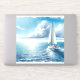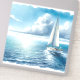 A serene coastal watercolor portraying a solitary sailboat gliding across calm blue waters beneath expansive, cloud-filled skies. Soft gradients of aqua, cerulean, and sunlit white create a tranquil rhythm, while gentle reflections ripple across the sea, evoking quiet movement and open possibility. The composition feels airy and contemplative, balancing vast sky and water with a sense of peaceful journey and timeless escape. This artwork captures a soothing coastal mood rooted in calm, freedom, and light, perfect for those drawn to breezy horizons and reflective moments by the sea. AI generated artwork.