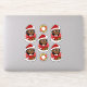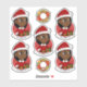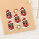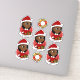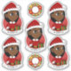 Ensemble de sept autocollants en vinyle coupé avec l'illustration d'une petite fille afro-américaine mignonne et souriante avec de longs cheveux noirs, qui est habillé en vêtements de Noël et porte un casquette du Père Noël rouge, sur un arrière - plan rouge ; cinq autocollants de la fille et deux autocollants avec une couronne de Noël ; avec un modèle texte personnalisable pour votre nom ou message