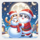 サンタクロースに扮した猫がクリスマスの夜に雪だるまと遊んでいる風景です。