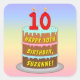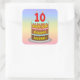 Ce sticker carré à thème d'anniversaire optimisé et joyeux présente une représentation de dessin animé d'un gâteau d'anniversaire à trois niveaux avec des bougies en forme de numéro sur le dessus montrant l'âge "10", avec le message "HAPPY 10TH BIRTHDAY," et un nom de destinataire personnalisé. L'arrière - plan a un motif multicolore pastel en arc-en-ciel inspiré du spectre dégradé. Des autocollants sur le thème de l’anniversaire comme ceux-ci peuvent être utilisés ou distribués à une fête célébrant le 10e anniversaire de quelqu’un, ou peut-être utilisés pour préparer des invitations ou envelopper des cadeaux/cadeaux pour un tel événement. [~Z0000624]
