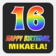 Ce sticker amusant, gai et coloré à thème d'anniversaire comporte un grand nombre de "16" et le message "HAPPY BANTHDAY", tous deux colorés avec un motif inspiré par un gradient de spectre arc-en-ciel, avec un nom personnalisé jaune audacieux. L'arrière - plan est noir de couleur. Des autocollants amusants comme celui-ci peuvent être utilisés pour envelopper les cadeaux donnés à quelqu'un pour célébrer son 16e anniversaire, ou peut-être être distribués aux participants à une fête d'anniversaire ou à une fête. [~Z0000480]